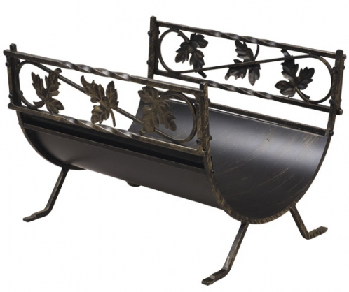 Стиль и элегантность дровниц данной модели покорили многих владельцев каминов. Оформленное в классическом стиле изделие декорировано ажурным поясом из кованых листьев, сплетенных в сквозной орнамент. Удлиненный корпус приподнят над поверхностью на кованых ножках, что визуально делает дровницу намного легче, изящнее. Данную модель стоит приобретать не только как функциональную вещь, гармонирующую с прочими аксессуарами для камина (защитным экраном, каминным набором). Помимо того, что изделие считается весьма практичным, дровница является также самостоятельным элементом декора. Изделие выполнено в черном цвете с добавлением отделки оттенка античного золота.