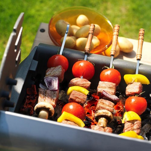 Контейнер очага чугунный, с гнездами для шампуров, удобный и функциональный, ручка для удобства перемещения тележки, рабочая доска с передней стороны, распределитель воздуха, регулирование решетки по высоте, несколько положений для вертела, двигатель и вертел в комплекте поставки, ветрозащитный экран из нерж. стали.