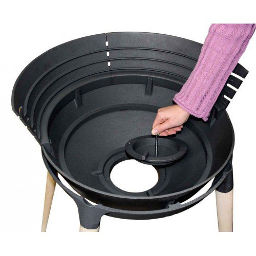 Легкая металлическая мобильная тележка. Полностью чугунный контейнер очага с защитным экраном. Устройство шлакоудаления внизу очага. Центральная вентиляция с диффузором. Решетка для древесного угля. Регулирование решетки по высоте. Боковые деревянные полки. Держатель посуды.
