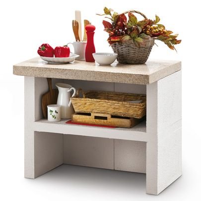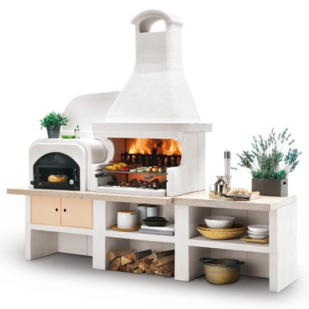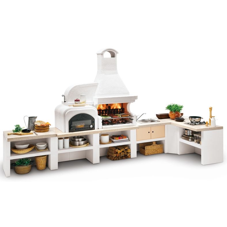 Выполнена из совместимых модулей. Столешница из полированного камня Marmotech. Основания всех модулей имеют заднюю стенку. Стальная решетка для дров и решетка из нержавеющей стали 76х40 см, с бакелитовыми ручками. Общие размеры: 450х85х218 cм.