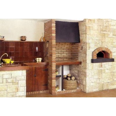 Комбинированная барбекю из камня Serol симметричного без шва. Центральный пилар, арка духовки и топка из огнеупорного кирпича, черная гранитная плита, грес. Дверцы из обработанного дерева, металлический короб черного цвета. Духовка размером 80 см, топка с решеткой для жарки и направляющими.
