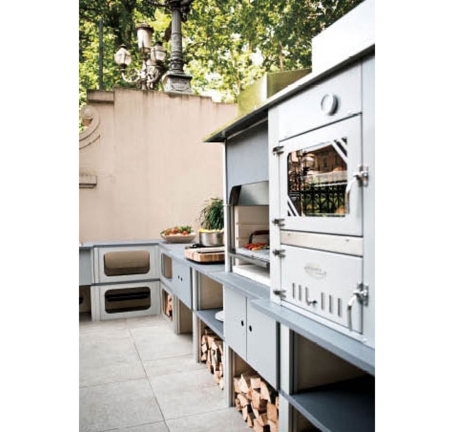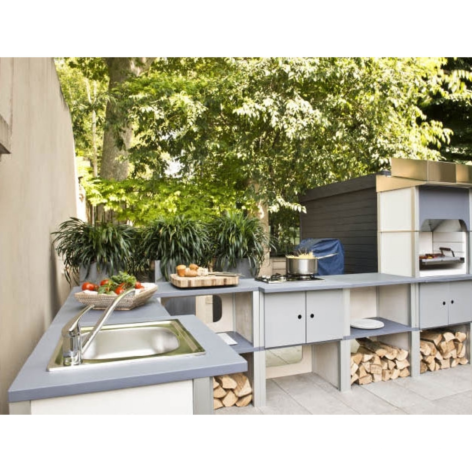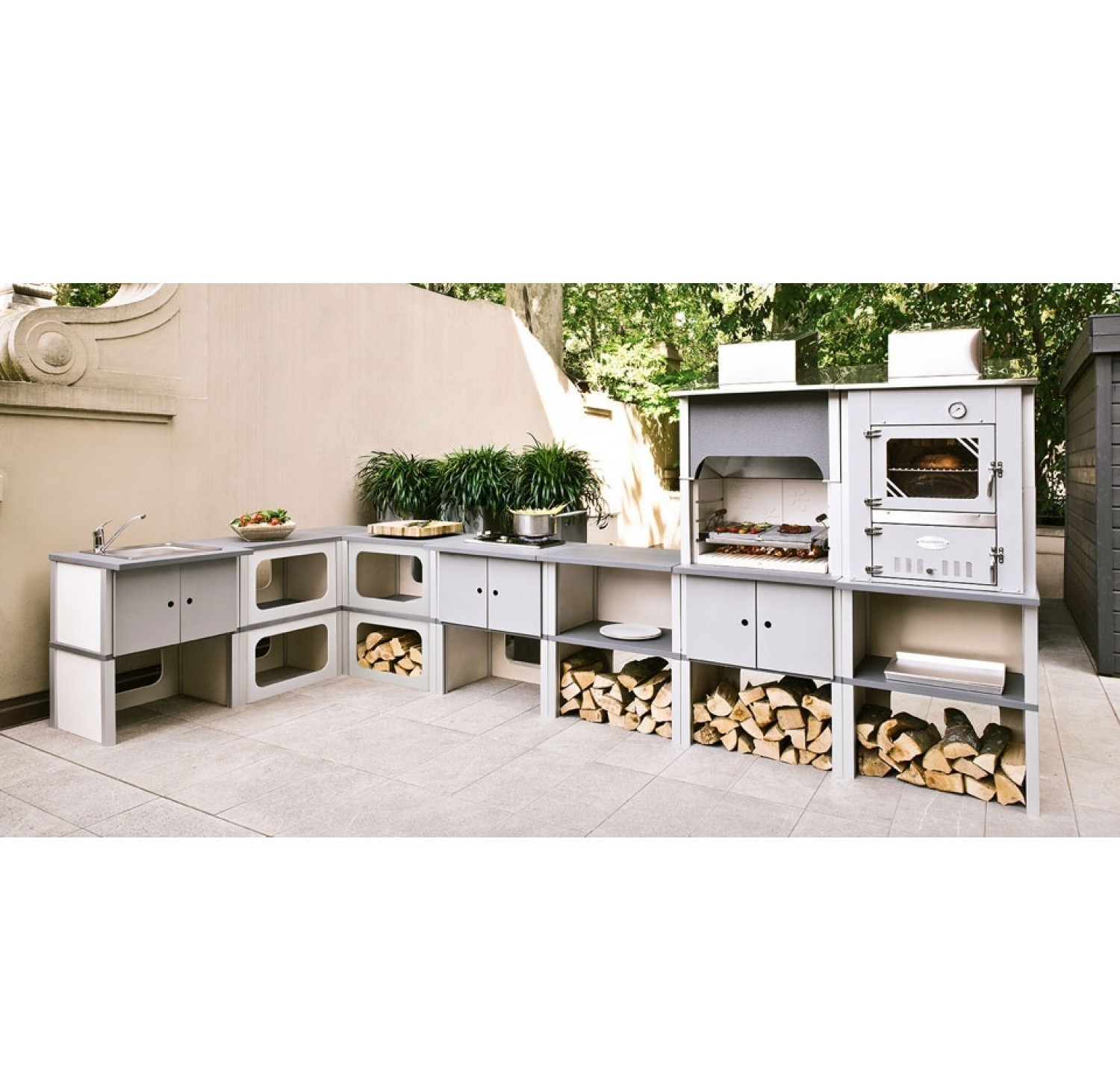 Программа St. Vincent специально разработана для садового расположения. Выполнена из совместимых модулей. Не требует укладочных и штукатурных работ. Легко разбирается и дополняется новыми модулями. Сделана из материалов, устойчивых к погодным изменениям. Духовка и раковина из нержавейки премиум-класса. Модуль гриль с топочной камерой из бетона и решеткой из нержавеющей стали 60х40 см.