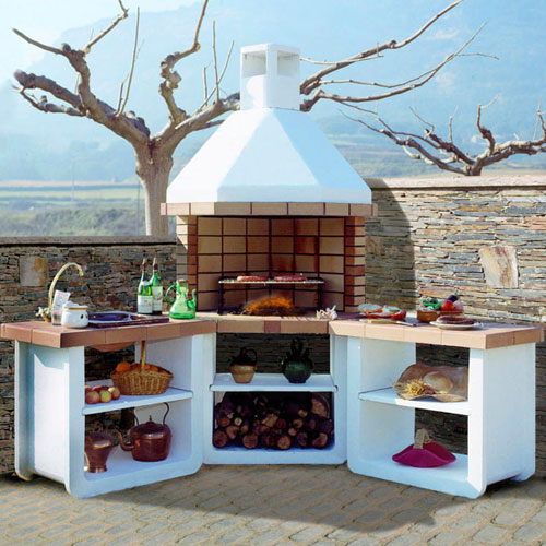 Угловая барбекю. Боковые банкетки и интерьер из конгломерата белого цвета. Топка и консоль из огнеупорного кирпича. Плита из греса с решеткой, зольник, решетка для жарки с креплениями.