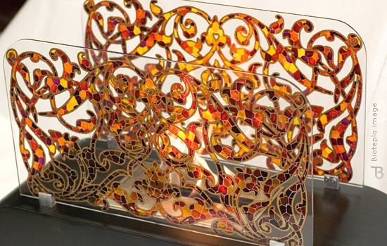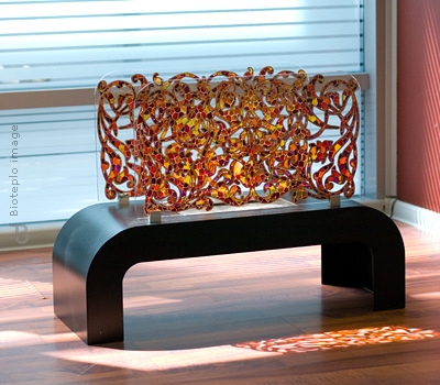 Модель «Самурай» может быть выполнена с витражными стеклами. В этом случае композиционный акцент модели смещается на цветной узор росписи, а пламя или свет, проходящий сквозь стекла биокамина подсвечивают созданный орнамент.