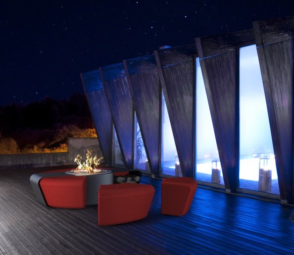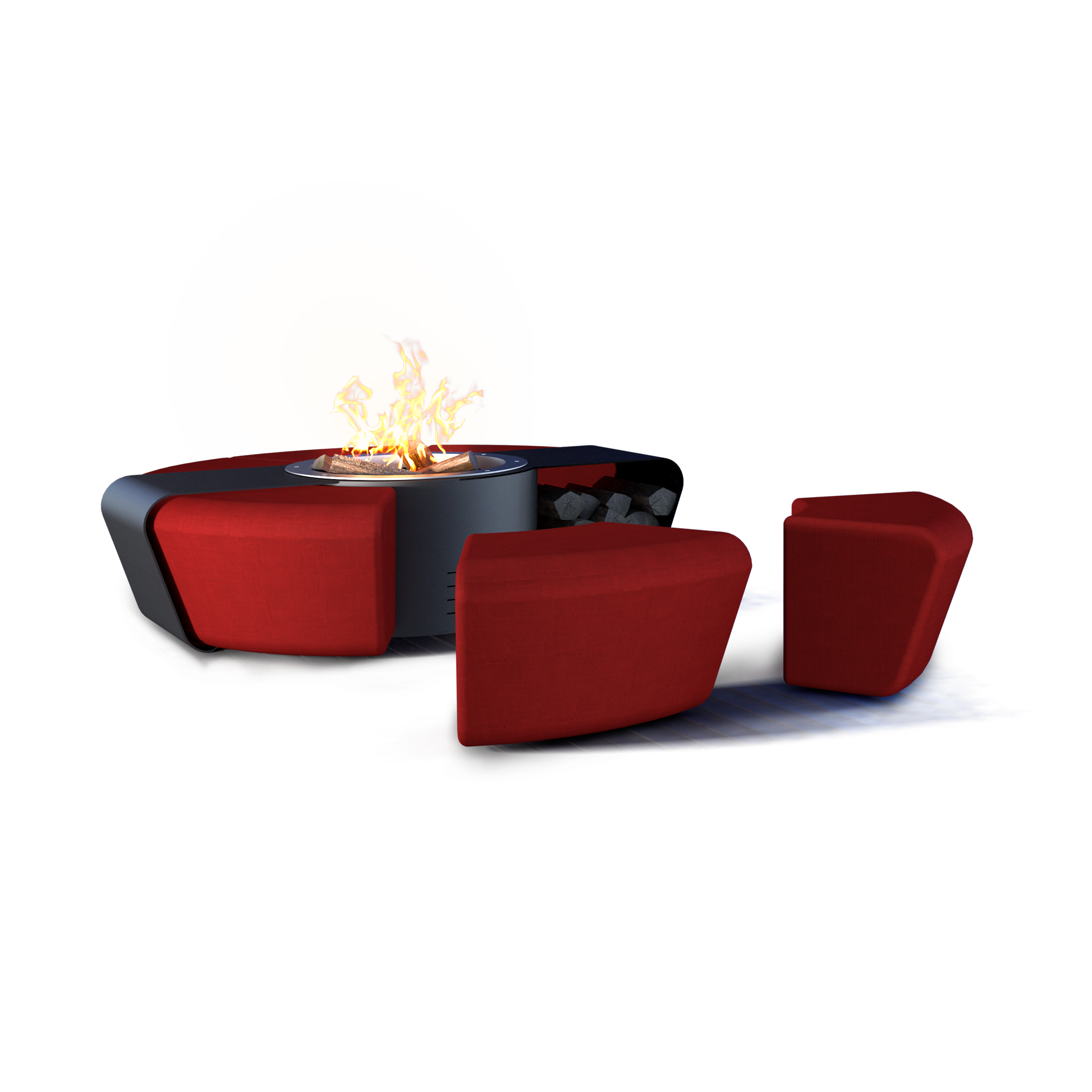 • Горелка из нержавеющей стали БРУЛЁР I + цилиндрическое термостойкое стекло + пуфы, облицованные тканью красного цвета (для использования на улице). Имеется опция: изменение цвета углеродистой стали (по запросу).