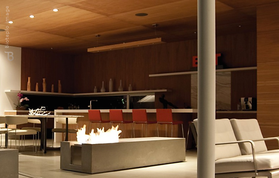 Биокамин, встроенный в имитацию бетонного блока или блока под клумбу. Концептуальное решение для ресторанов и офисных интерьеров.