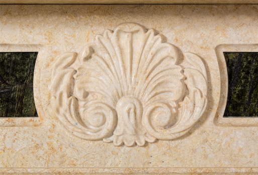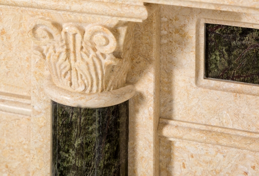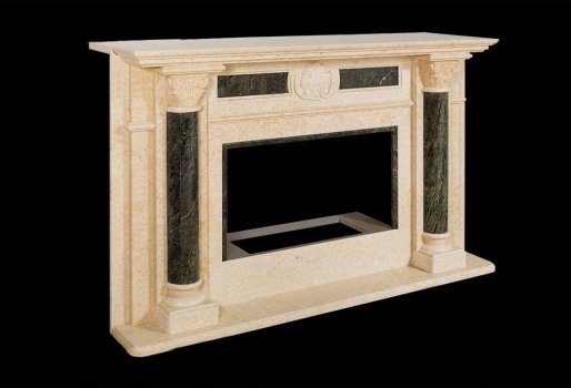 Каминный портал в классическом стиле, выполненный из двух сортов натурального камня. Сочетание двух камней позволяет создавать выразительный и живописный облик портала, освежающий интерьер и привносящий в него пикантность. Антаблемент камина украшен классическими барельефами, импозантными, с обилием тщательно прорисованных деталей.