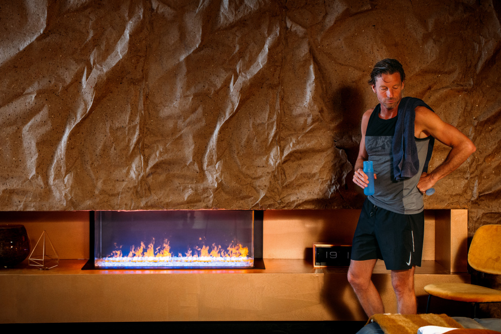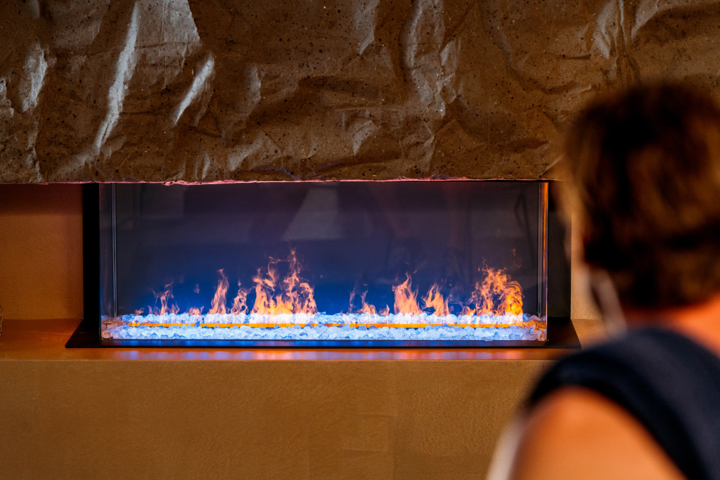 Чтобы стенки камина не запотевали, мощные вентиляторы непрерывно втягивают водяной пар. Из-за движения пара пламенные языки подрагивают как настоящие, что также увеличивает реалистичность камина.