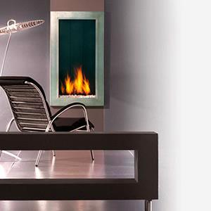 Современный встраиваемый камин Faber Straight Framed с элегантной вертикально-ориентированной рамкой темно-серого цвета или из нержавеющей стали. Закрытая топка. Не подходит для классического дымохода.