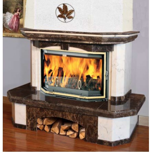 Пристенная каминная облицовка призматической формы выполнена из полированного мрамора Crema Marfil и Emperador или Rosso Portugallo и Emperador.