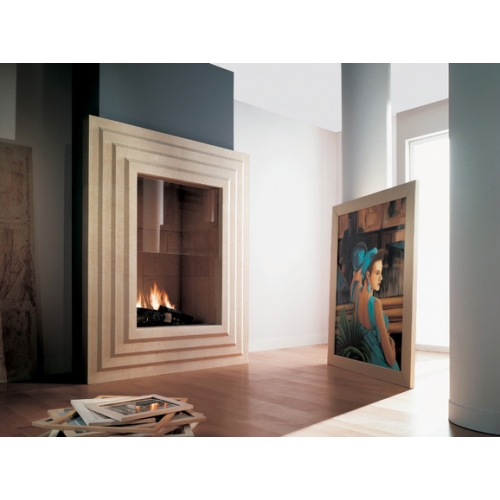 Встроенный камин с рельефным обрамлением из натурального камня Chazelles. Большая открытая топка с футеровкой из шамотных блоков. Стеклокерамическая панель.