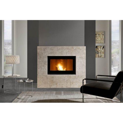 Полувстроенный камин, обрамление выполнено из камня Martigny с нанесением иероглифов. Прямой фасада, топка с большим огнепрочным стеклом. Увеличенный обзор огня.