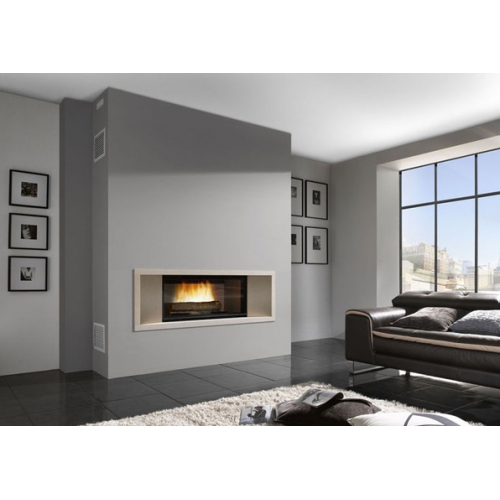 Широкая модель встроенного камина с большим горизонтальным стеклом. Каминная рамка выполнена из камня.