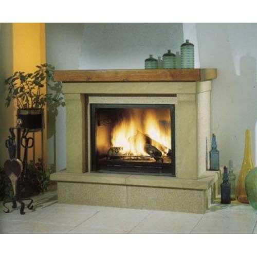 Фронтальный или угловой камин серии Stylo из полированного песчаника Arenisca в сочетании с бучардированным. Деревянная балка и металлическая топка 904, колосник и зольник.