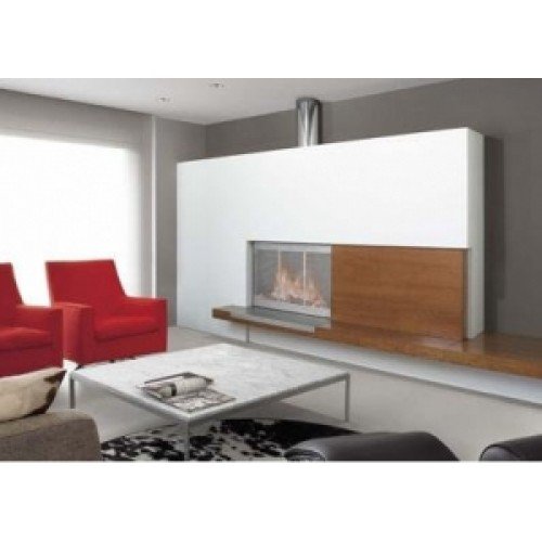 Пристенный камин. Плита и фасад отделаны шпоном вишневого дерева. Горизонтально подвижный защитный экран модели Swing 90 Intro из матовой нержавеющей стали. Металлическая топка Class 90 с зольником и колосником.