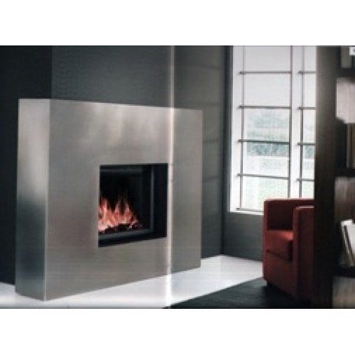 Асимметричный камин из матовой нержавеющей стали. Панорамная топка Double 75.