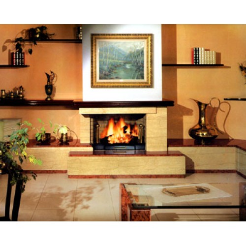 Фронтальный камин из полированного мрамора Crema Benedetta. Плита и цоколь из красного полированного мрамора Rosso Forte. Балка из формированного дерева. Металлическая топка из огнеупорного кирпича, открытая сбоку.