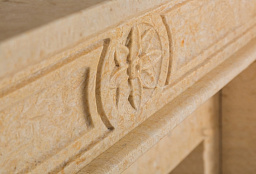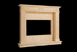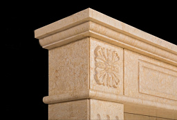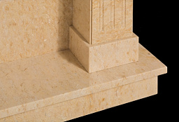 - Камин выполнен из состаренного травертина Yellow, состаренного и бучердованного мрамора Crema Marfil.