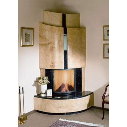 Угловой камин из мрамора Crema Marfil poliert, столешница, плинтус, вставки из полированного мрамора Rosa Valencia poliert.