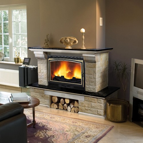 - Материал: колотый песчаник, золотистый цвет, полки и балка - LabradoriteПодходящие топки шириной „700 мм” с прямым стеклом