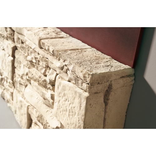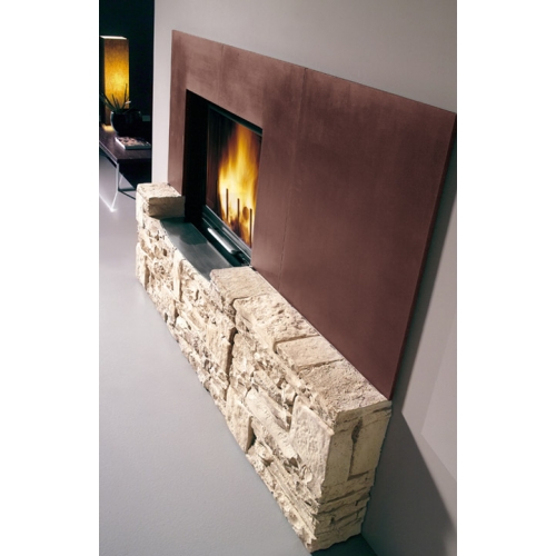 Пристенный камин Palazzetti Alaska из декоративного бетона, окрашенного с помощью натуральных оксидов в белый или золотисто-песочный цвет (по выбору) для реалистичного эффекта натурального камня, положенного всухую. Верхняя панель из декоративного материала, цвета античной меди или металла (по выбору).