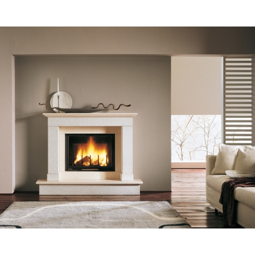 Каминный портал Palazzetti Siena из белого бучардированного камня с полированными столешницей и обрамлением.