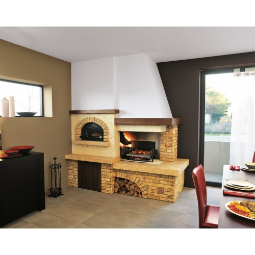 Угловой камин Palazzetti Spoleto выполнен из рустикального мрамора Soleado. Столешница из шлифованного мрамора Giallo Egizio и деревянными вставками облицованными дубовым шпоном под орех.