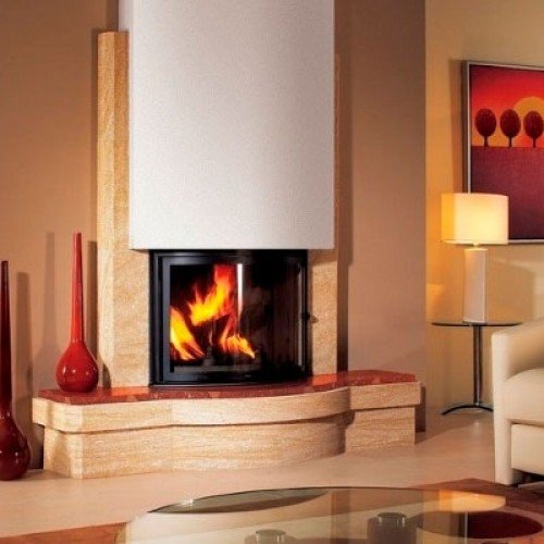 Полувстроенный камин. Изготовлен из камня Castillon + красный "Rocmarble" Corallin. Кожух на выбор.