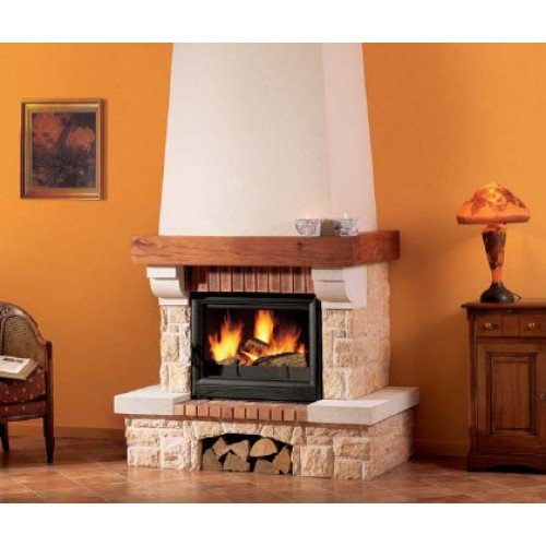 Пристенный камин из разноцветного бутового камня, белого камня Provence. Балка из дерева экзотической породы Iroko. Элементы из разноцветного бута выполнены в старинном французском стиле. Широкая гамма совместимых топок.