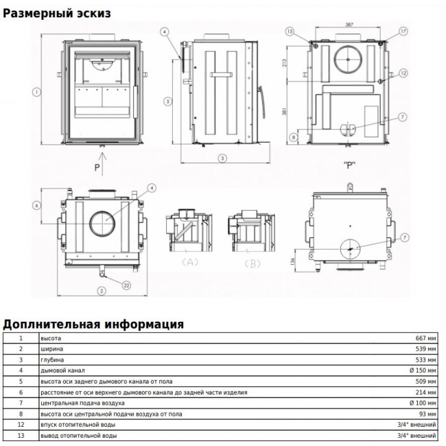 К этой топке подключается дымоход диаметром 150 мм. Вы можете заказать как готовый комплект, так и отдельные элементы.