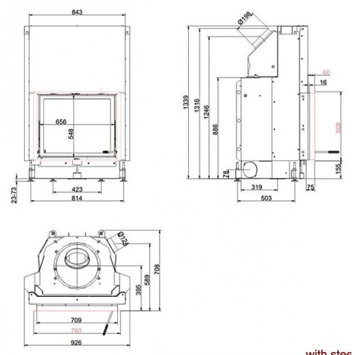 Стальная топка с прямым стеклом. Подъёмная дверца (Система Easy-Lift). Горизонтальное открывание двери для чистки стекла. Ширина дверки 656 мм, высота - 548 мм. Возможно подключение воздуха из-вне.
