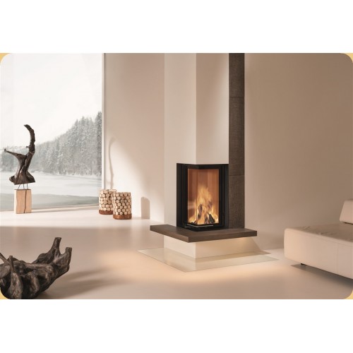 Угловая каминная топка с цельным Г-образным стеклом. Дверца с подъемным механизмом (система Easy-Lift). Топочная камера футерована шамотом. Ширина дверки 338/338 мм, высота - 702 мм. Возможно подключение воздуха из-вне.