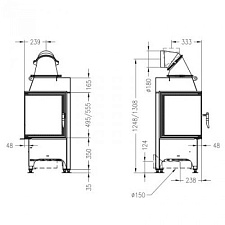 Трёхсторонняя каминная топка. Топочная камера футерована шамотом. Подъёмный механизм двери (система Easy-Lift). Ширина дверки 422/425/422 мм, высота - 409 мм. Возможно подключение воздуха из-вне.