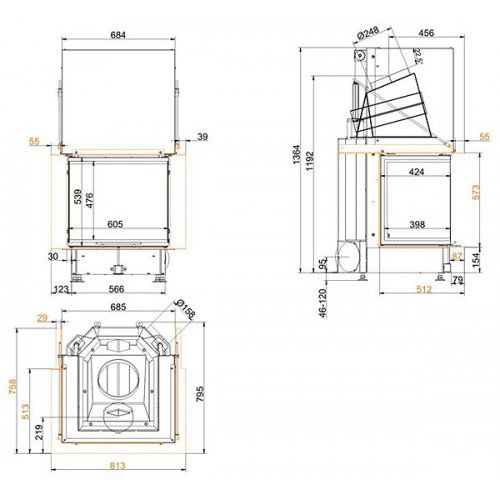 Трёхсторонняя каминная топка. Топочная камера футерована шамотом. Подъёмный механизм двери (система Easy-Lift). Ширина дверки 398/605/398 мм, высота - 476 мм. Возможно подключение воздуха из-вне.