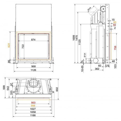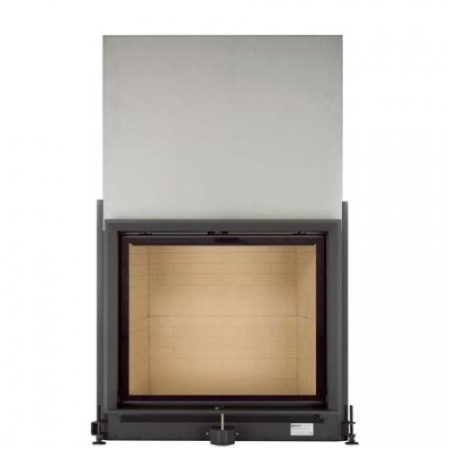 Каминная топка с прямым стеклом. Топочная камера футерована шамотом. Подъёмный механизм двери (система Easy-Lift). Ширина дверки 874 мм, высота - 722 мм. Возможно подключение воздуха из-вне. В комплекте поставляется декоративная или монтажная рамка.