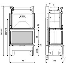 Термостойкость стекла до 800 гр Ц., в зависимости от модели топки, возможно применение двухстороннего или самоочищающегося стекла. Дымовая труба проходящая через длинный шибер для дополнительного теплого воздуха из газов - экономия на каждый день
