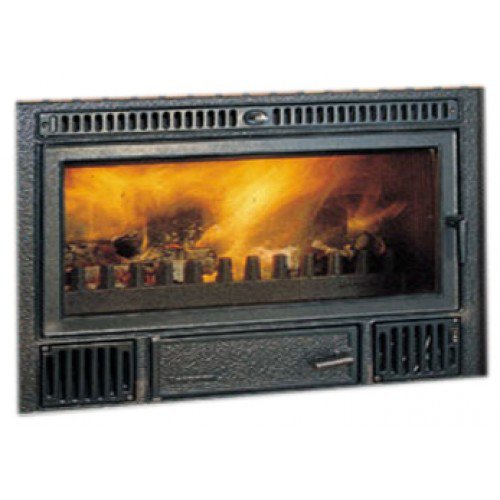 Высокоэффективная встраиваемая каминная топка C-3/80 из огнеупорного чугуна, с прямым фасадом и дверкой с керамическим стеклом. Имеется предохранительный термостат.
