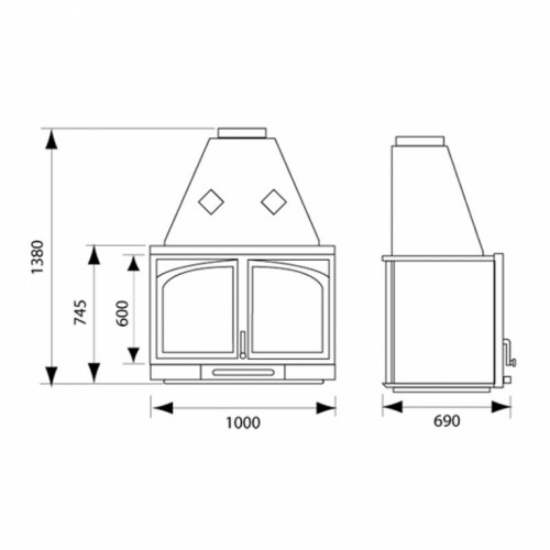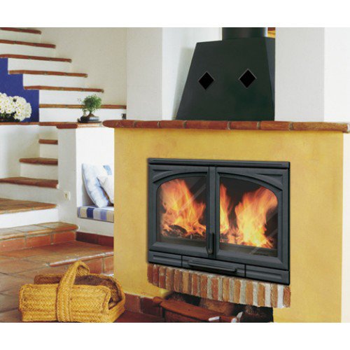 Оснащена оригинальными распашными дверцами с огнеупорным керамическим стеклом.