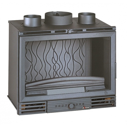 Уникальный каминный очаг, функционирующий на дровах и оснащенный не только фронтальным стеклом, но и оригинальной боковой стеклянной вставкой для лучшей визуализации горящих поленьев. Стекло устойчиво к высоким температурам и может выдержать до 750*С. Система “чистое стекло” контролирует прозрачность материала в процессе эксплуатации агрегата. Конструкция предусматривает наличие 2-х турбин, функционирующих с двумя различными скоростями. Благодаря наличию штатного распределителя тепла и специальной разводки труб, нагретый воздух подается в смежные помещения. КПД составляет 70%. Материал топки – высококачественный чугун с отличными показателями в плане концентрации тепла и теплоотдачи. Дымосборник способствует увеличению эффективности обогрева.  Агрегат разработан на базе новейших технологий, соответствующих экологическим нормам, принятым в европейских странах (NF). Кроме того, топка имеет сертификат “Зеленое пламя” (Франция). Съемные рабочие элементы обеспечивают беспроблемную замену отказавших узлов в случае их механического повреждения. В частности, к таким элементам топки относятся: дефлектор, колосник, дровяной ограничитель и задняя стенка топки. Важным элементом системы безопасности является термовыключатель, срабатывающий в аварийных ситуациях.