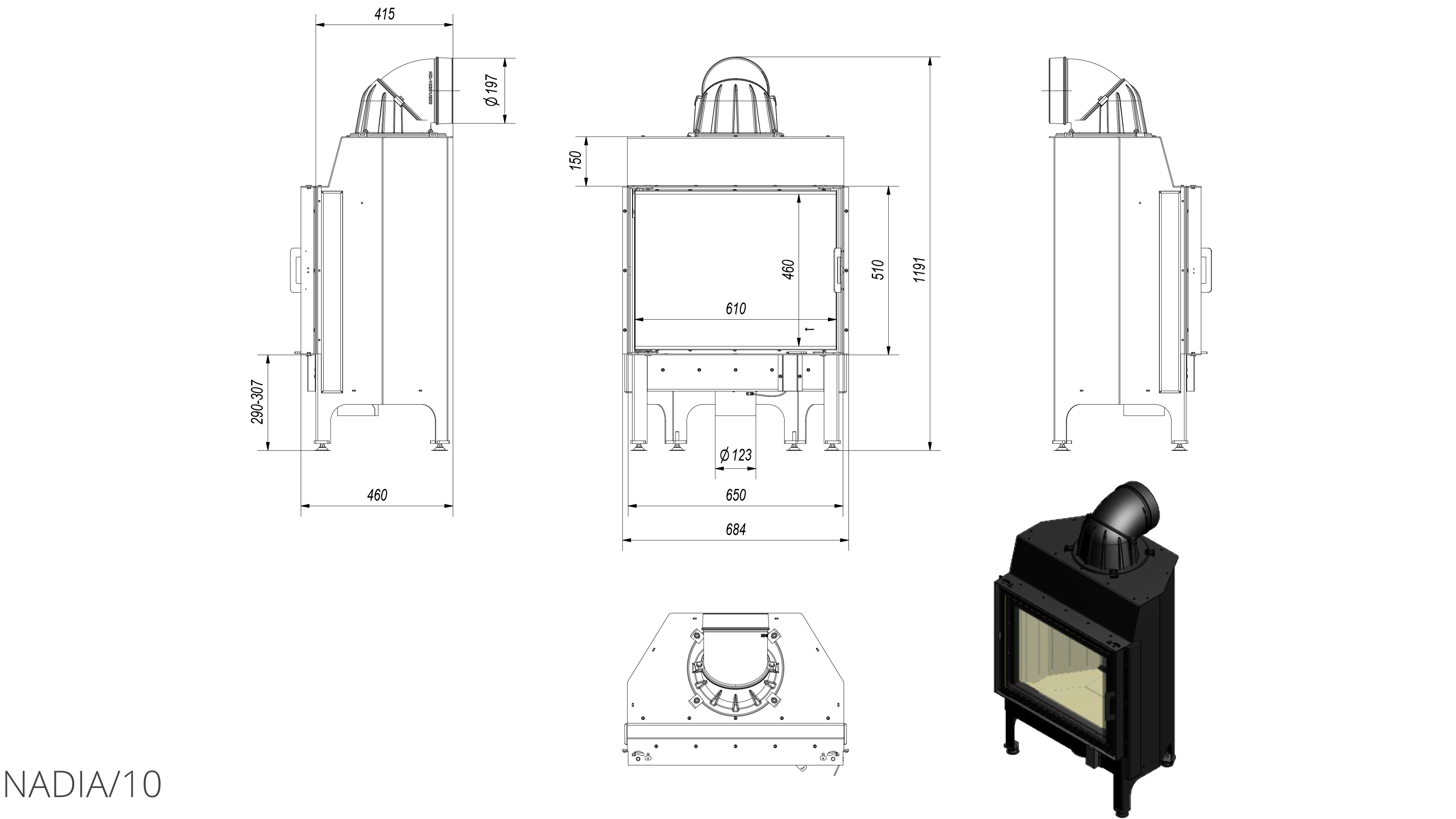 Nadia является футеровкой с корпусом и передним картриджем, которые изготовлены из стальных листов, благодаря чему подходят для эксплуатации в условиях повышенных температур. Представленная модель обеспечена декоративным стеклом, которое выдерживает очень высокую температуру, оно покрыто методом трафаретной печати, который обеспечивает камину современный и очень элегантный внешний вид.