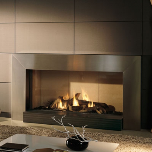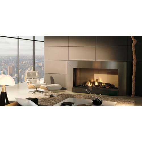 Горизонтальная топка на метане или сжиженном газе. Металлический черный обклад с вертикальными засечками. В комплекте - пульт ДУ, керамические дрова.