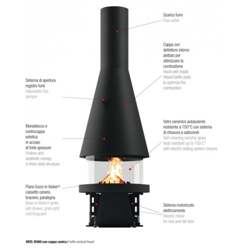 Круглый очаг, подъемная дверца с автоматической системой подъема и опусканий, панорамное стекло 360°.