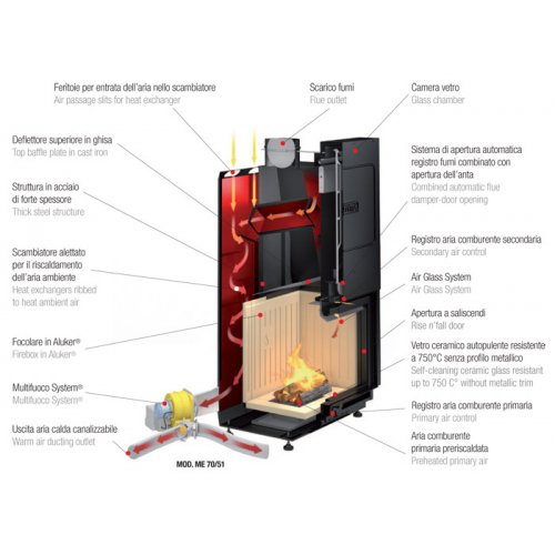 - Конструкция: Материал: эмалированная сталь. С закрытым очагомТопка: Жаропрочное покрытие АлукерКожух: СтальОчаг: Жаропрочный Алукер и чугунПроем: Дверца из эмалированной стали с керамическим стеклом, выдерживающимтемпературу до 750°, с самообдувом. Подъемная дверца, открывание на петлях для чистки.Ручка дверцы: Скрытая и съемнаяПрофильдверцы: Эмалированная стальПервичный воздух: Регулируется вручнуюВторичный воздух: ФиксированныйВыход дымохода: ВерхнийШиберная заслонка: Регулируемая и автоматическаяЗольник: ВынимаемыйТопливо:. ДроваОтопление: Естественная конвекция, лучистый обогрев и дополнительная вентиляция с искусственной тягой через систему Multifuoco