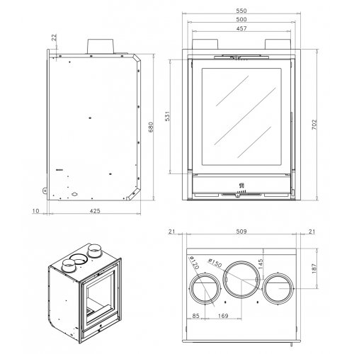 Дровяная топка со стальным корпусом, внутренние стенки из вермикулита. Представленная модель отличается удобной дверцей, которая может открываться как влево, так и вправо. Широкая дверь, большой обзор огня. Дверь оборудована окном из жаропрочного стекла, выдерживающее температуру до +750 градусов. Выдвижной зольный ящик облегчает процесс по уходу за прибором.