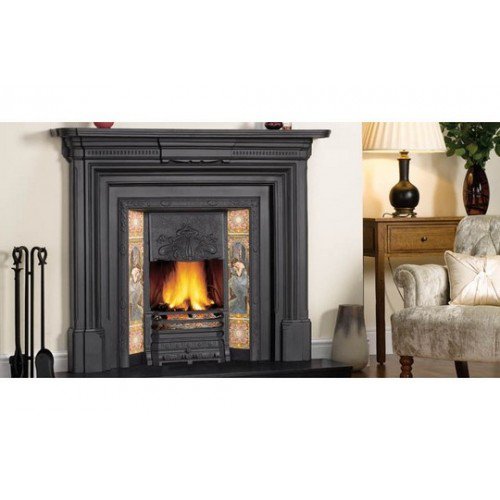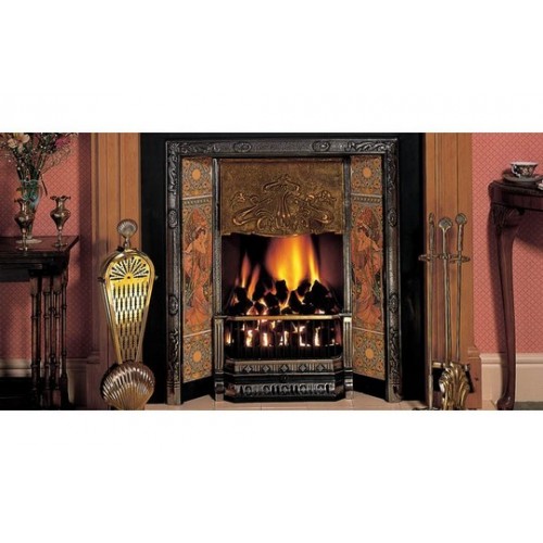 Art Nouveau - открытая чугунная каминная топка в английском стиле. Расположение топки фронтальное. Компактная каминная топка из чугуна со скошенными стенками изготовлена по старинным технологиям. Она украшена литым чугунным рельефом. Данная топка может быть полированная либо черная и она может быть декорирована изразцами, расписанными в технике итальянской майолики. . Пол перед камином выложен плиткой и оформлен металлическим бортиком.