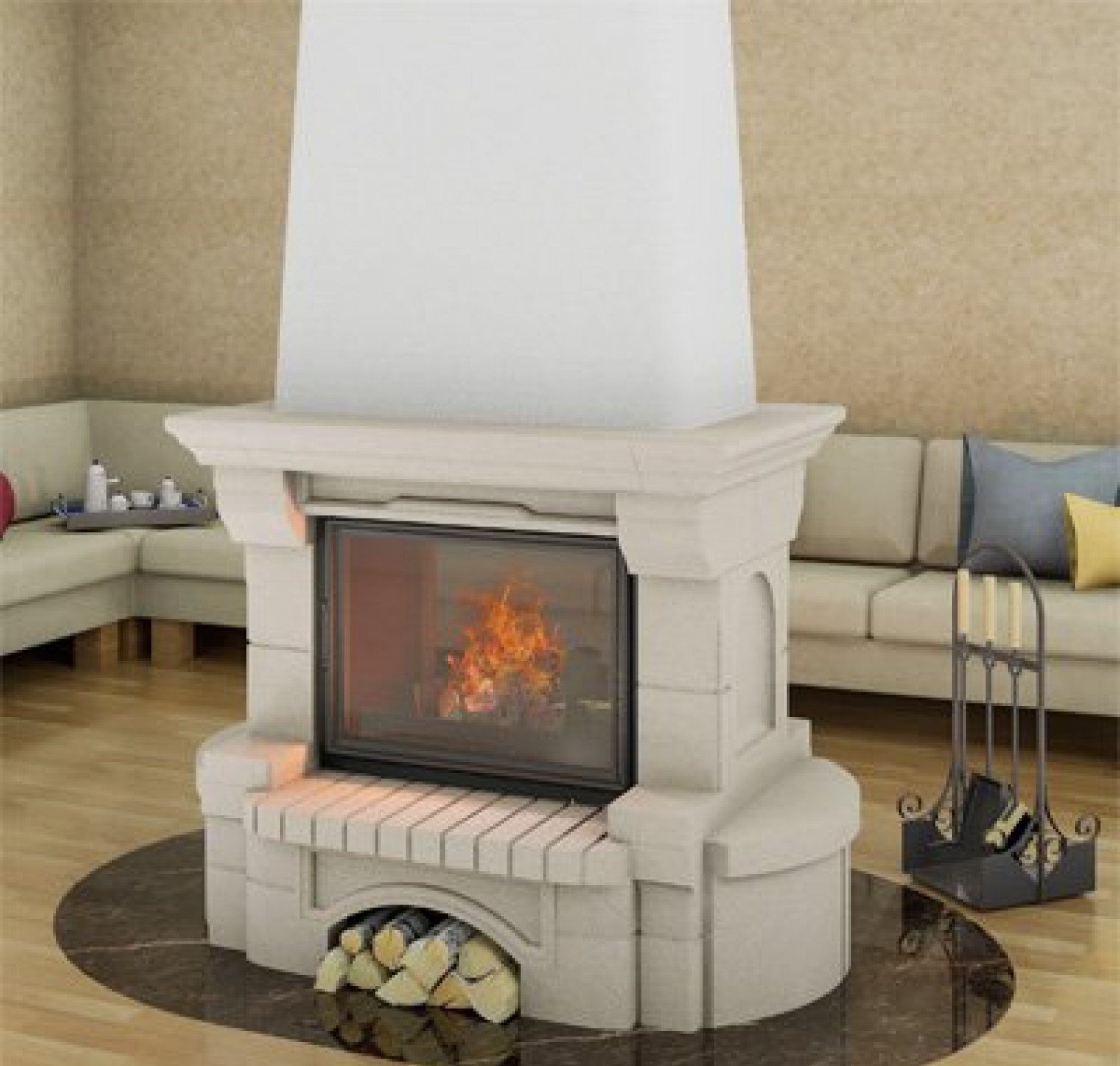 Готовый камин можно установить в центре гостиной, либо поделить пространство в помещении, например, между гостиной и кухней.