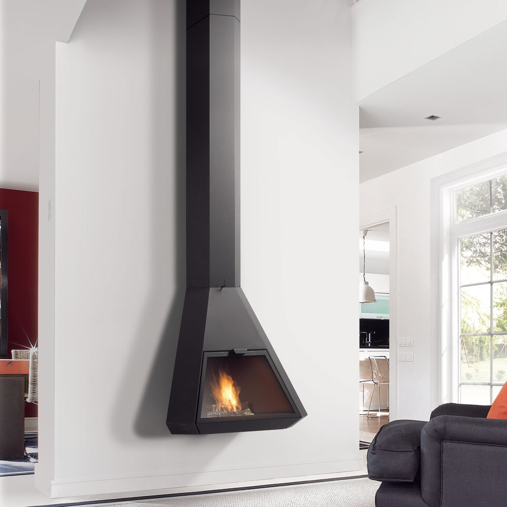 Пристенный камин, дверца со стеклом, включает крепеж к стене. Цвет - черный.