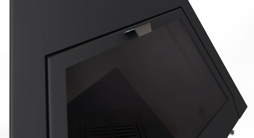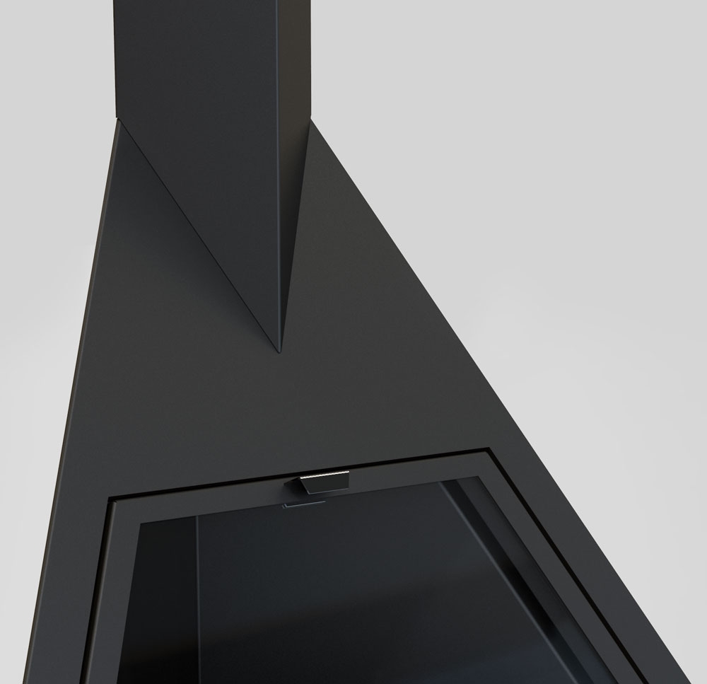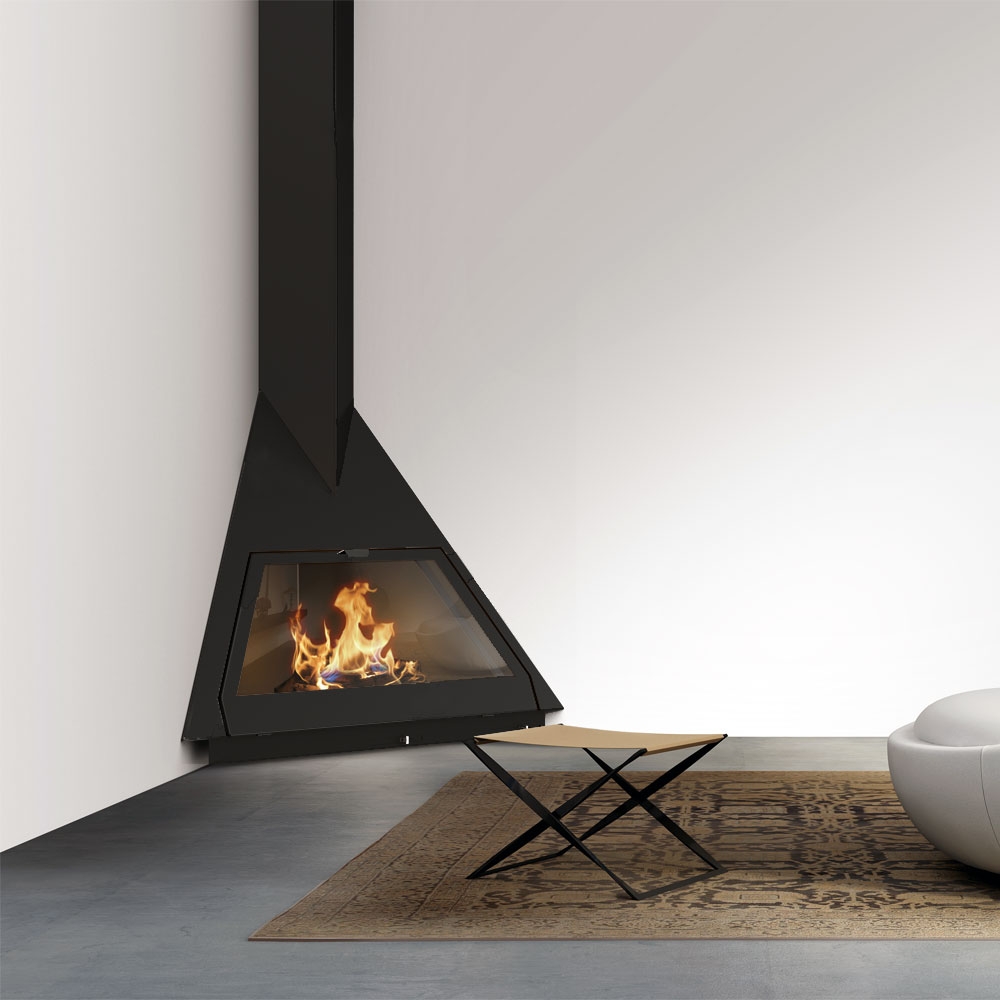 Угловой дровяной камин Foxi оригинальной треугольной конструкции и футуристического хай-тек дизайна от талантливых специалистов компании Traforart. Необычное исполнение данной модели камина прекрасно подойдет для создания красивых креативных интерьеров разнообразных как творческих, так и деловых пространств. Оригинальный дизайн модели «освежит» любое помещение, привнесет в него концептуализм и высокую идею. В то же время, стильный черный цвет облицовки, сбалансированные пропорции и строгие линии камина Foxi как нельзя лучше поддержат бизнес атмосферу помещения.