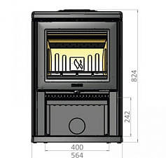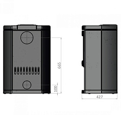 Фронтальный камин со стеклом. Вертикальная центральная труба. Камин изготовлен из особой стали. Отделан огнеупорной черной краской, которая выдерживает температуру 650º.
