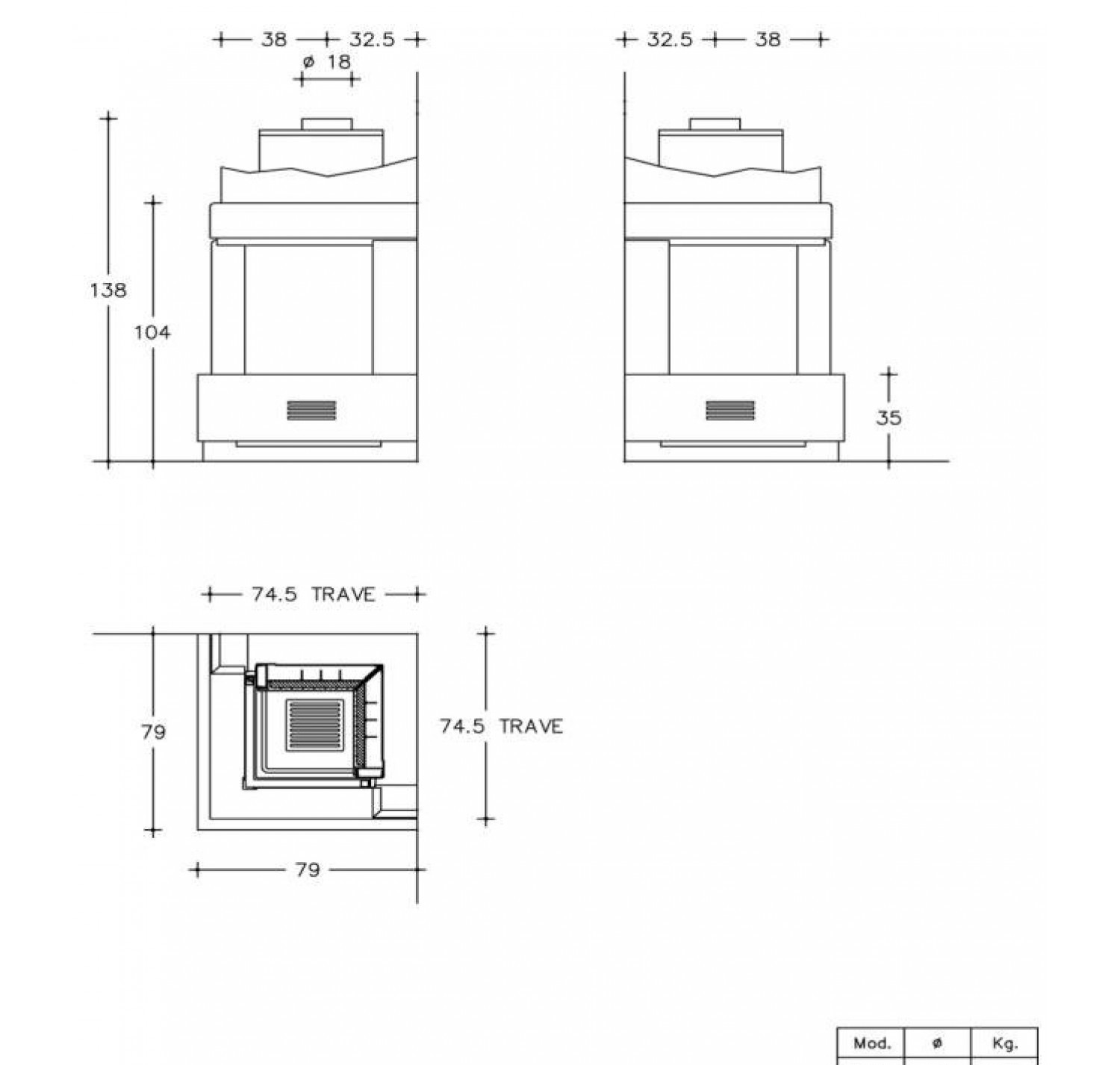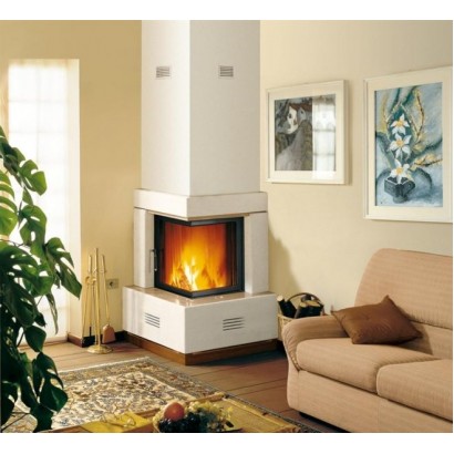 Облицовка из мрамора Trani. Очаг из полированного мрамора Verdello с деревянной кромкой Ramin.  На фото представлена модель с дровяной топкой 510A. Dx - стекло слева Sx - стекло справа Техническая информация